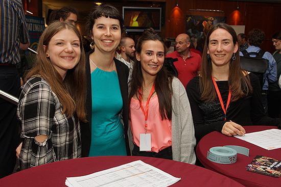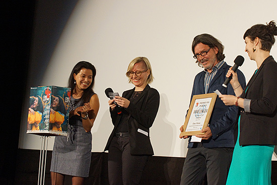 Auch die Festivalbesucher konnten Preise gewinnen: Luisa Pérez und Kathrin Frenz losen die Gewinner des Sprachkurses und der CINELATINO-Dauerkarte für 2019 aus.