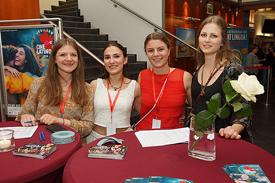 Franziska, María, Lucca und Nicole heißen die Gäste im Kino willkommen.