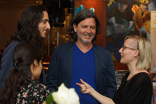 En el foyer del cine charla Pol antes de su función con el director del festival Paulo de Carvalho, con la coordinadora del festival Kathrin Frenz y con la intérprete Michelle Pérez.
