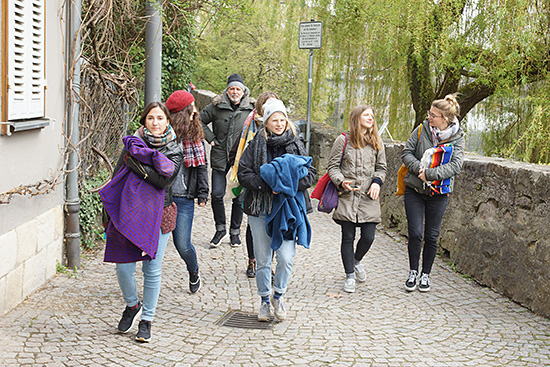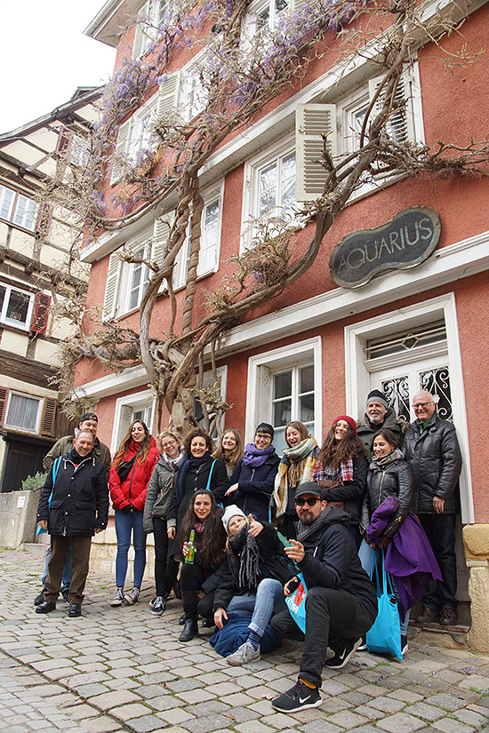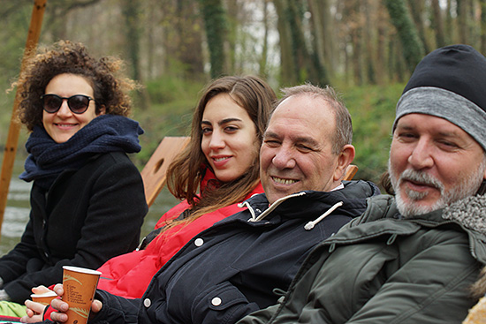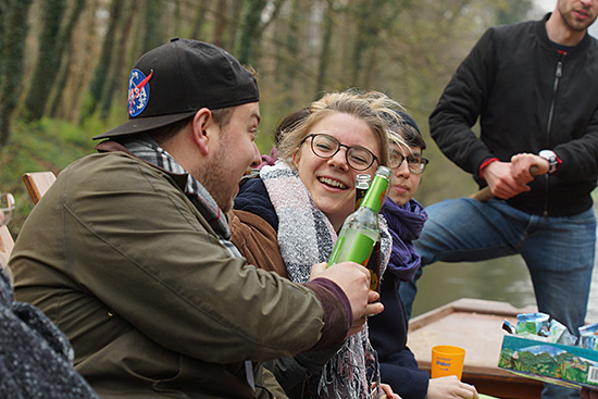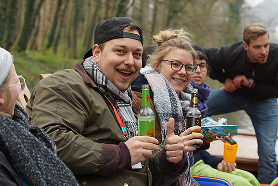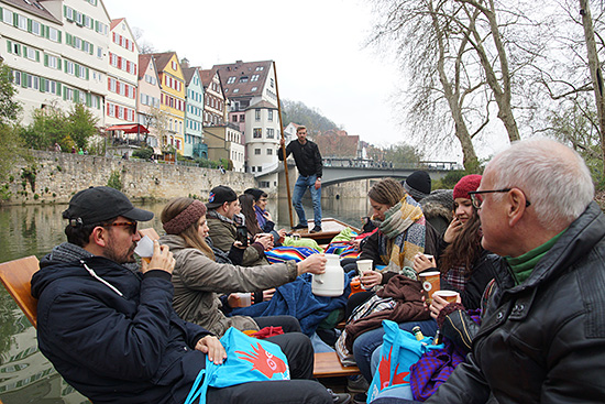 Trotz bewölktem Wetter genießen das Team und die Festivalgäste die Stocherkahnfahrt.