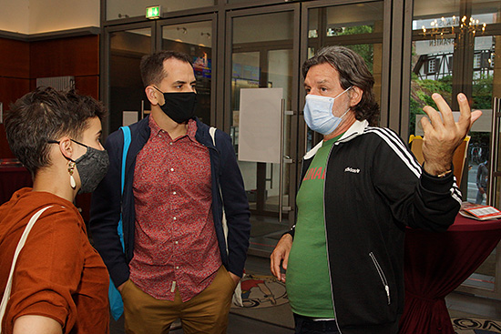 Janira Nili Medina vom Team, Regisseur Marc Serena und Festivalleiter Paulo de Carvalho unterhalten sich im Kinofoyer, während die ersten Gäste für den Dokumentarfilm El escritor de un país sin librerías ins Kino kommen.
