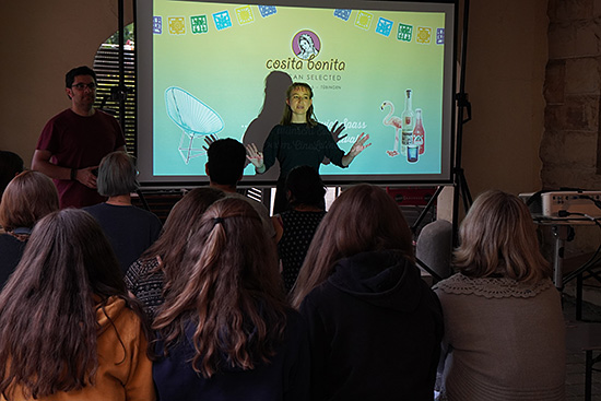 Lea Geigle vom Festivalteam bei der Filmeinführung zum komplett ausverkauften Galápagos, paraíso en pérdida.