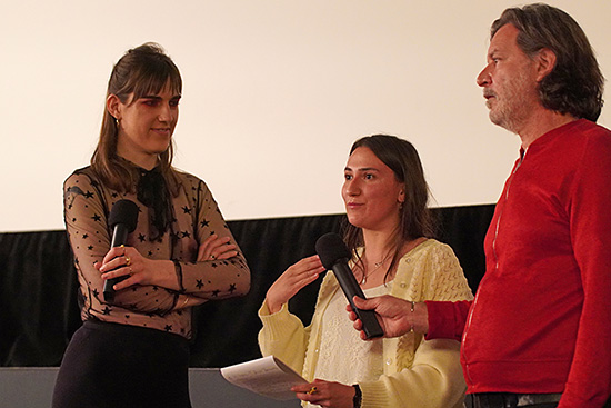 Festivalleiter Paulo de Carvalho und Festivalkoordinatorin María Vallecillos Soldado mit Gast Raphaëlle Pérez bei ihrem Publikumsgespräch in Tübingen.