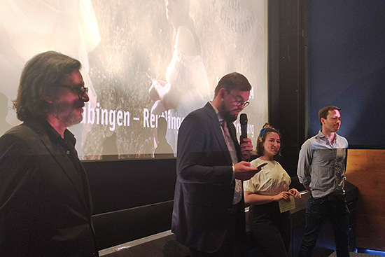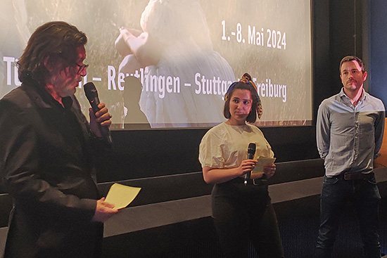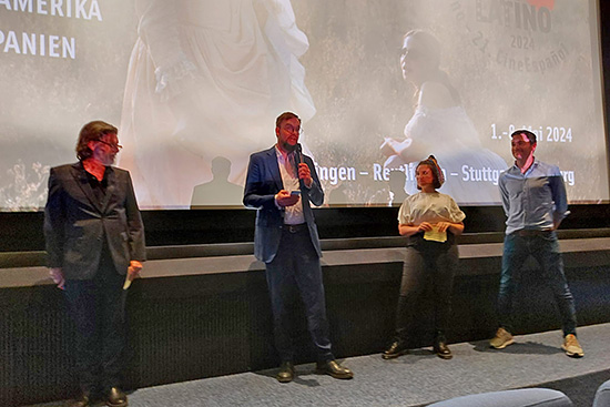 Einen Tag später wird das Festival in Stuttgart von Co-Leiterin María Vallecillos Soldado und Festivalleiter Paulo de Carvalho im Delphi Arthouse Kino gemeinsam mit Geschäftsführer Simon Erasmus und Kulturamtsleiter Marc Gegenfurtner (li) eröffnet.